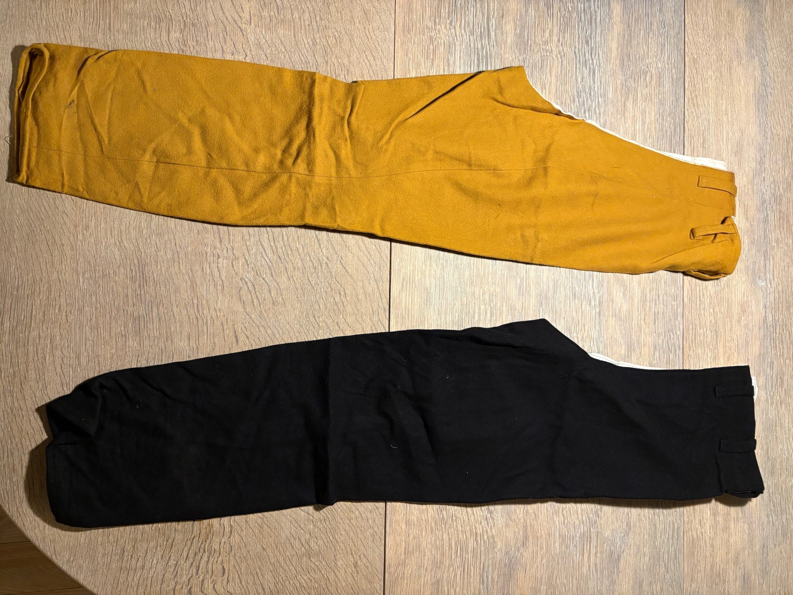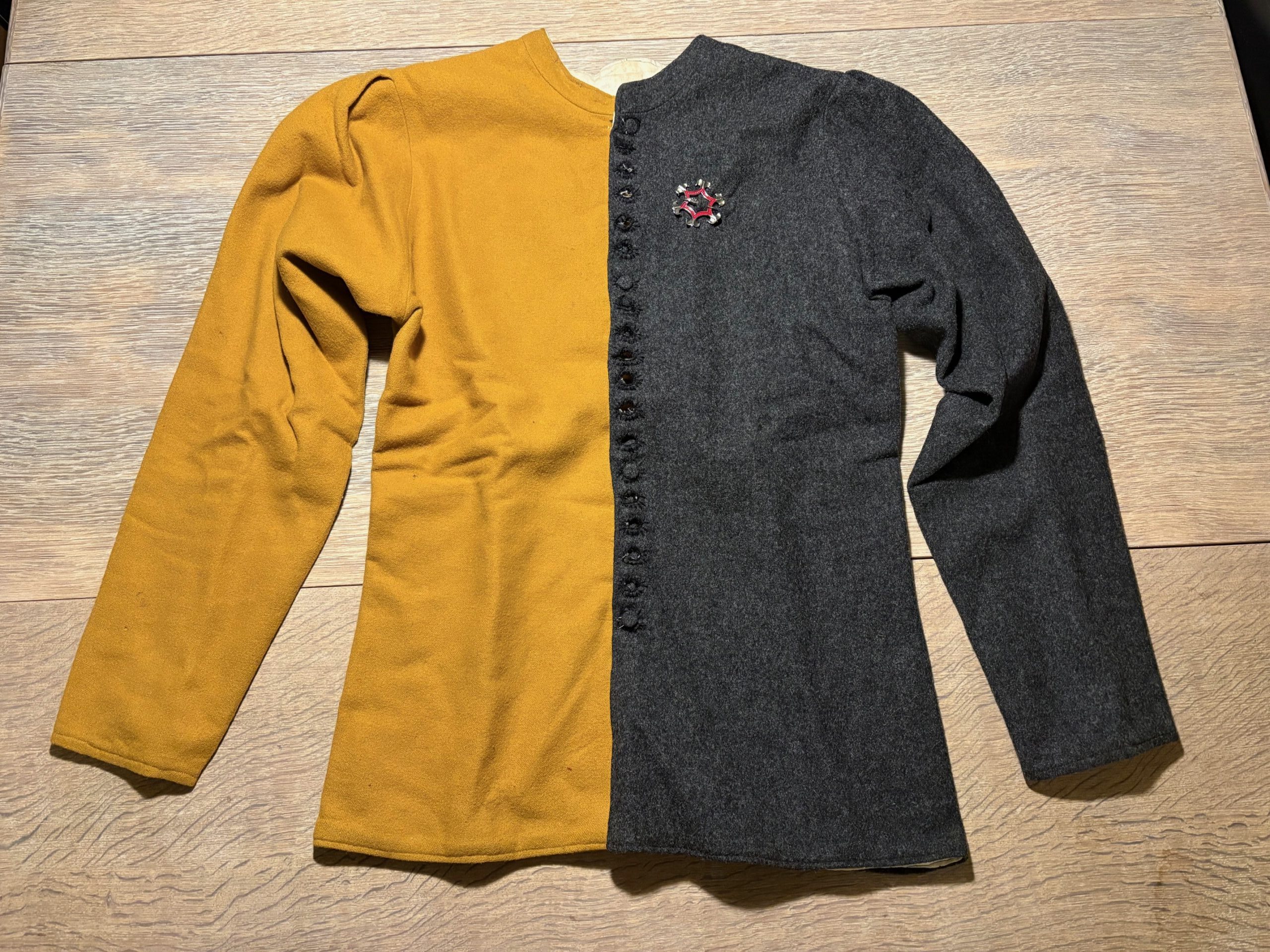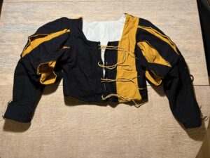 - Krop: En sort og gul doublet. Denne skal gerne være i uld og forret med hør, da dette er et nemt syprojekt og den vil være behagelig at gå rundt i. Har du en landsknecht er dette også super fedt. Har du ikke mulighed for at købe eller sy en doublet selv, kan man købe en sort trøje og pynte den med gule farver, f.eks. ved at binde sløjler på. Vi anbefaler man har en skjorte på inden under.