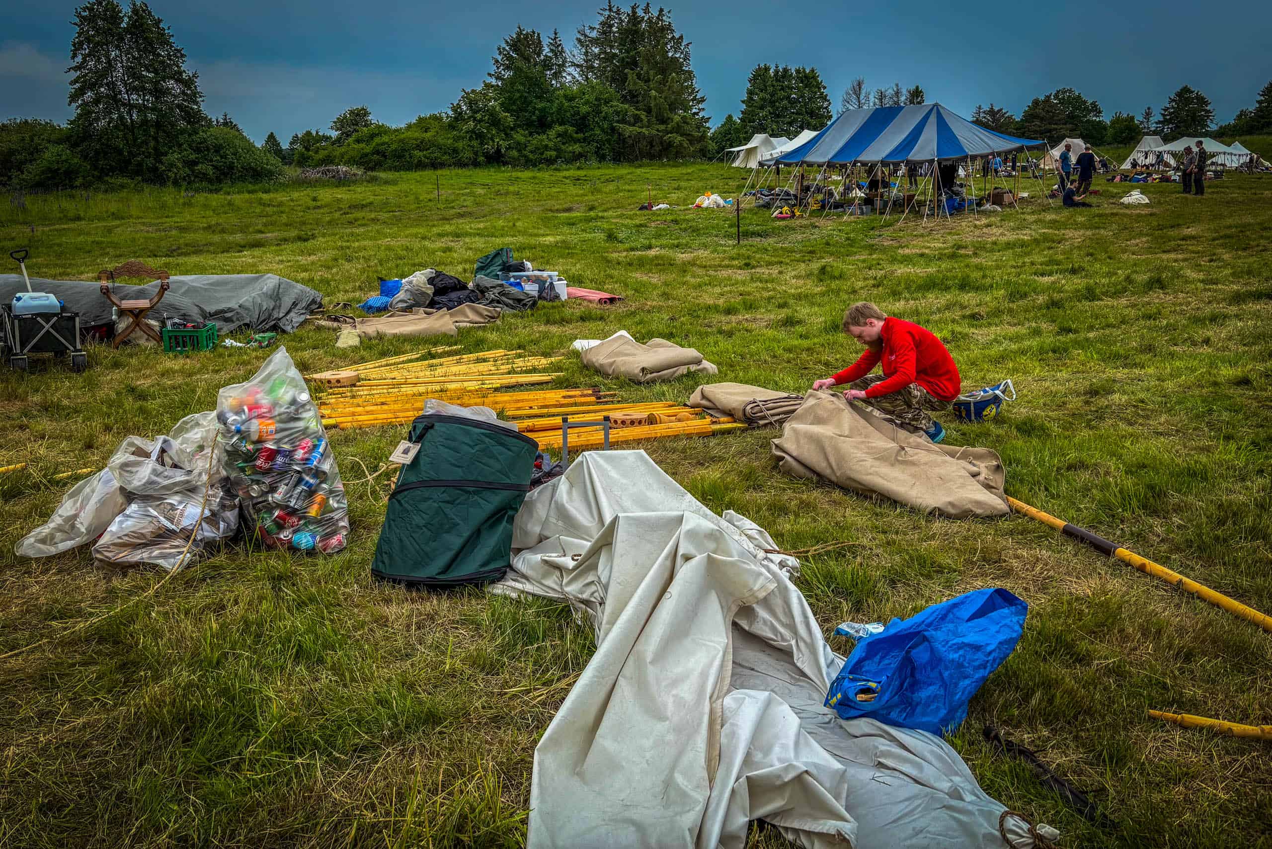 - Vi løfter i flok. Det forventes at alle hjælper med nedpilning af lejr og fællesgrej. Vi håber også i vil hjælpe med opsætningen d. 28. Under Krigslive vil der også være en række fællesopgaver såsom oprydning og vandhentning som vi forventer folk hjælper med